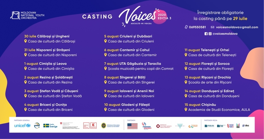 Astfel, din data de 30 iulie ia start concursul național Voices, în cadrul căruia vor fi parcurși peste 8000 kilometri pentru a întâlni zeci de copii cu vârstele cuprinse între 10 și 16 ani, dintre care vor fi selectați 101. Acești tineri vor susține 5 concerte alături de Moldovan National Youth Orchestra în perioada 2020-2021, urmând ca familia Voices să enumere peste 200 de beneficiari.
