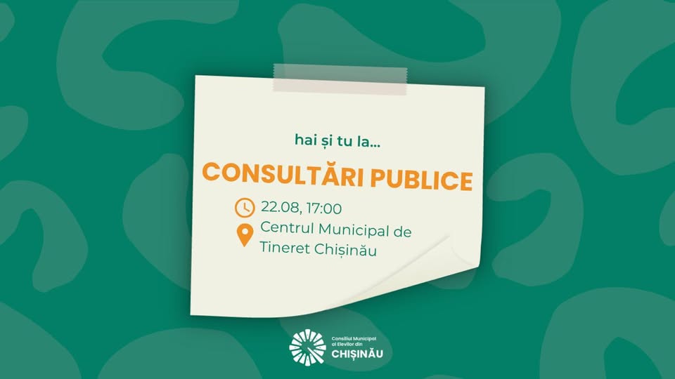Primăria municipiului Chișinău, prin Direcția Generală Educație, Tineret și Sport, anunță că vineri, 22 august 2025, ora 17:00, la Centrul Municipal de Tineret, va avea loc consultarea publică a noii versiuni a Regulamentului Consiliului Municipal al Elevilor și al Consiliilor Locale de Sector.